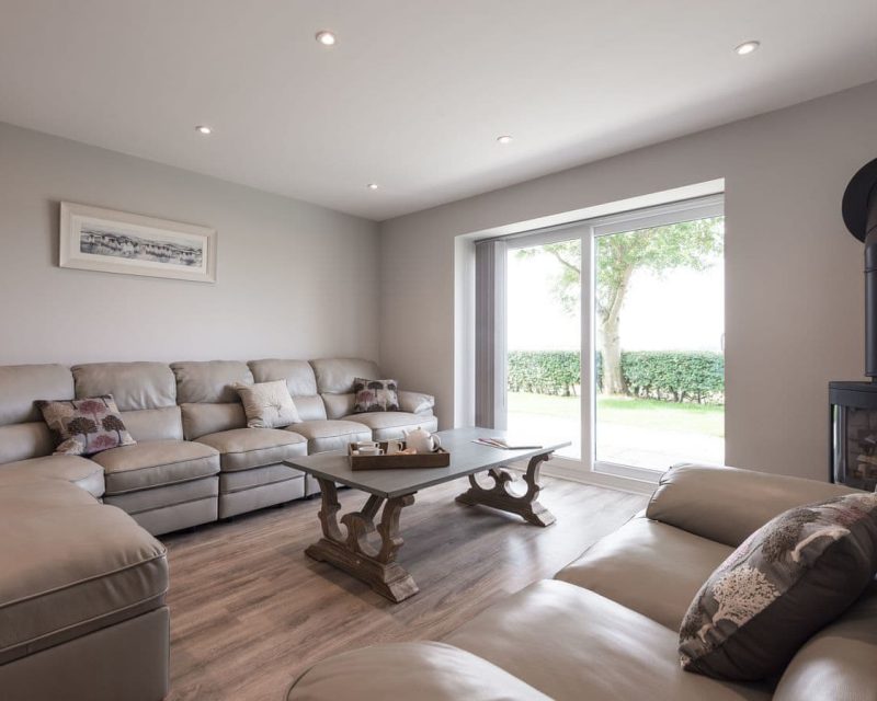 Living area includes 55” smart TV, American style fridge freezer, wine cooler and patio doors leading to the garden.